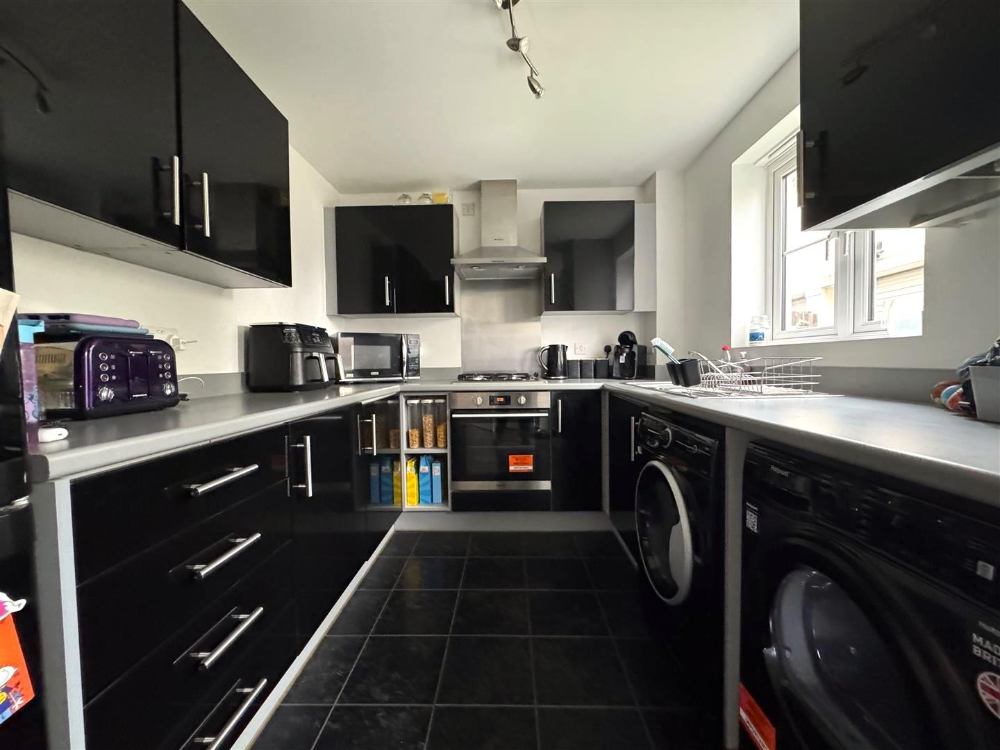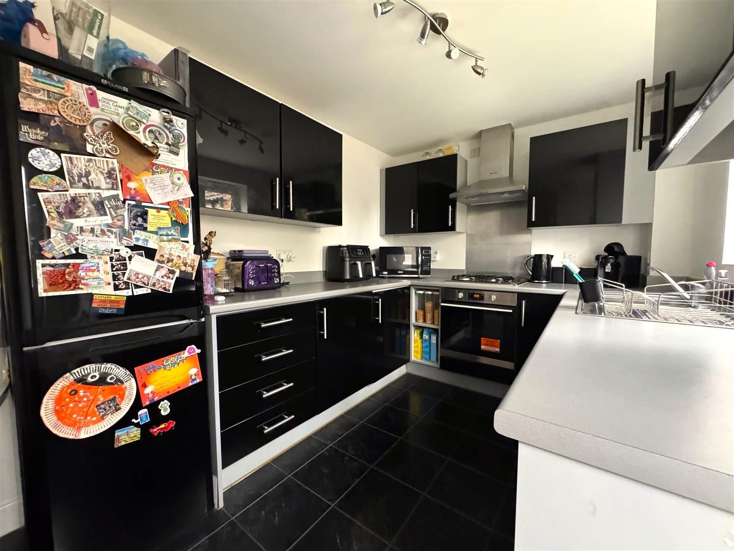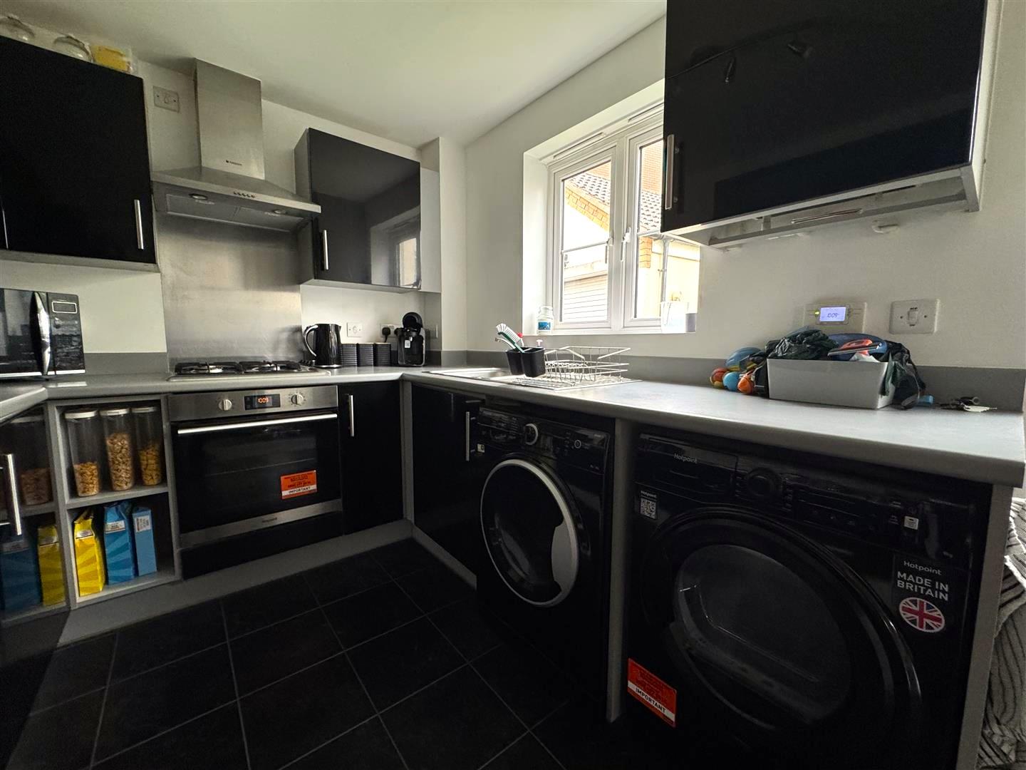Wwindow to rear, units at eye and base level with matching worktop, integrated electric fan oven with four burner gas hob and extractor fan over, one and a half basin stainless steel sink, space and plumbing for washing machine, space for tingle drier, space for fridge/ freezer, large understairs storage cupboard, uPVC door to rear garden, radiator