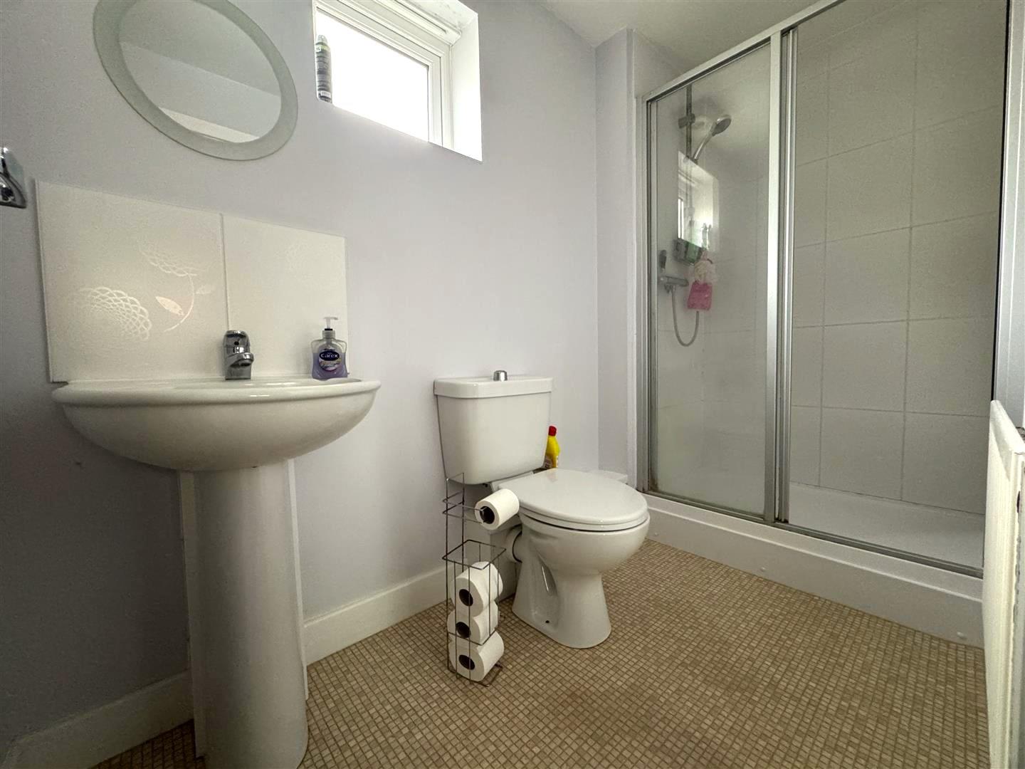 Window to rear, bath with shower over, pedestal wash basin, low level wc, radiator