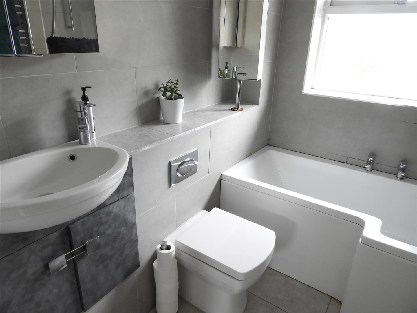 Modern bathroom with underfloor heating, 'P' shaped bath with shower over and shower screen, WC, mounted wash basin, heated towel rail