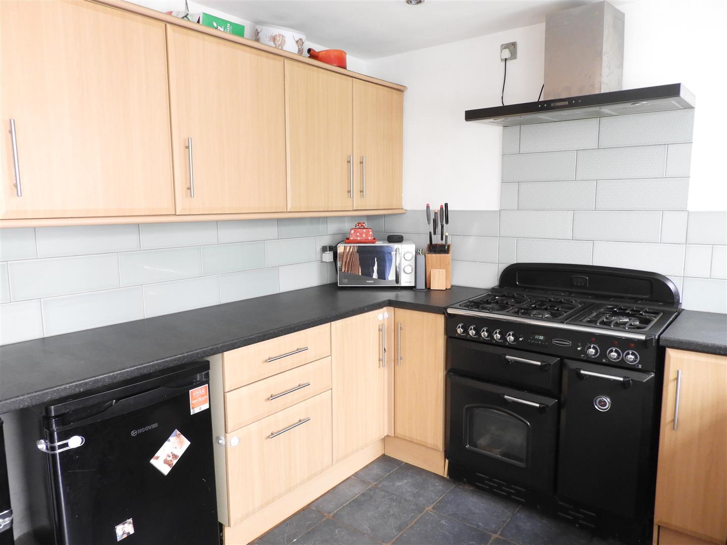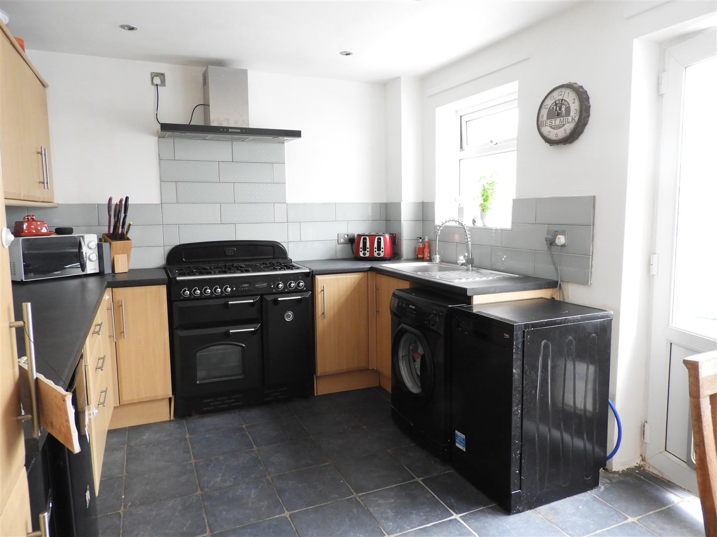 Modern fitted kitchen with window to rear aspect, single stainless steel sink, space for under-counter fridge and freezer, space and plumbing for washing machine, space and plumbing for slimline dishwasher, Rangemaster cooker with 5 burner hob, extractor fan, space for family dining table, door to conservatory