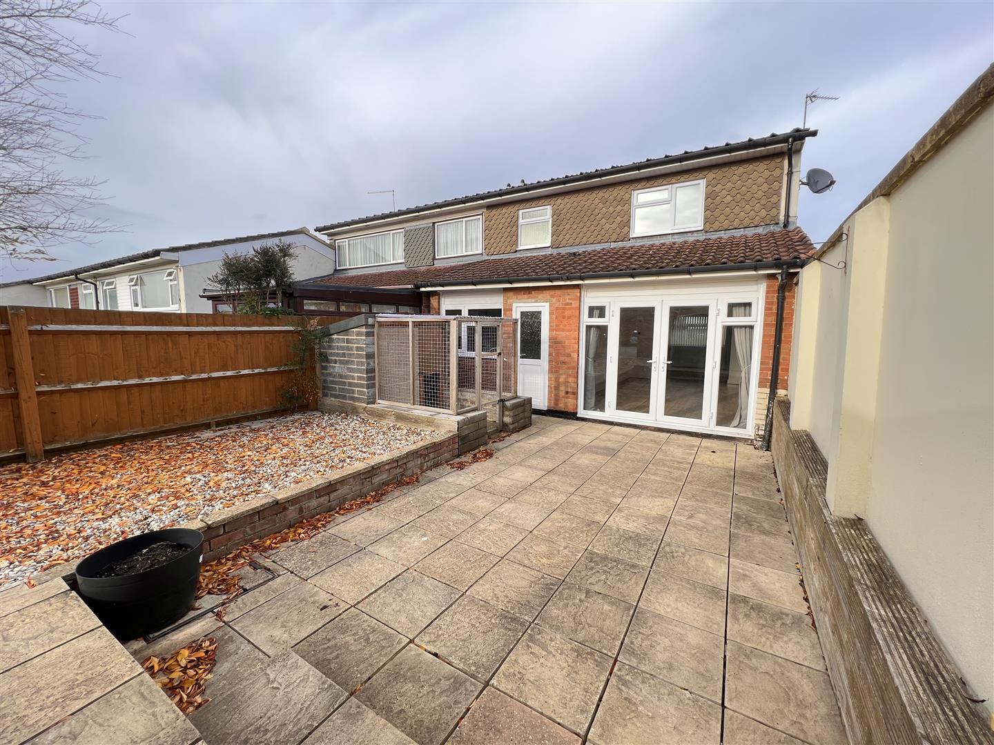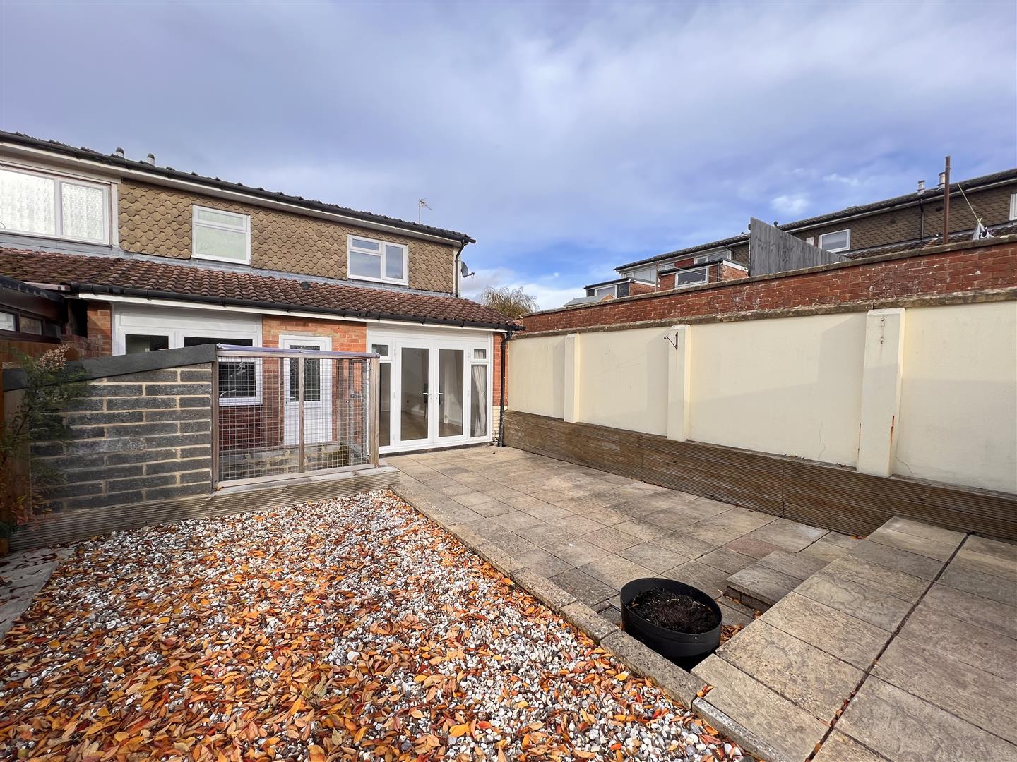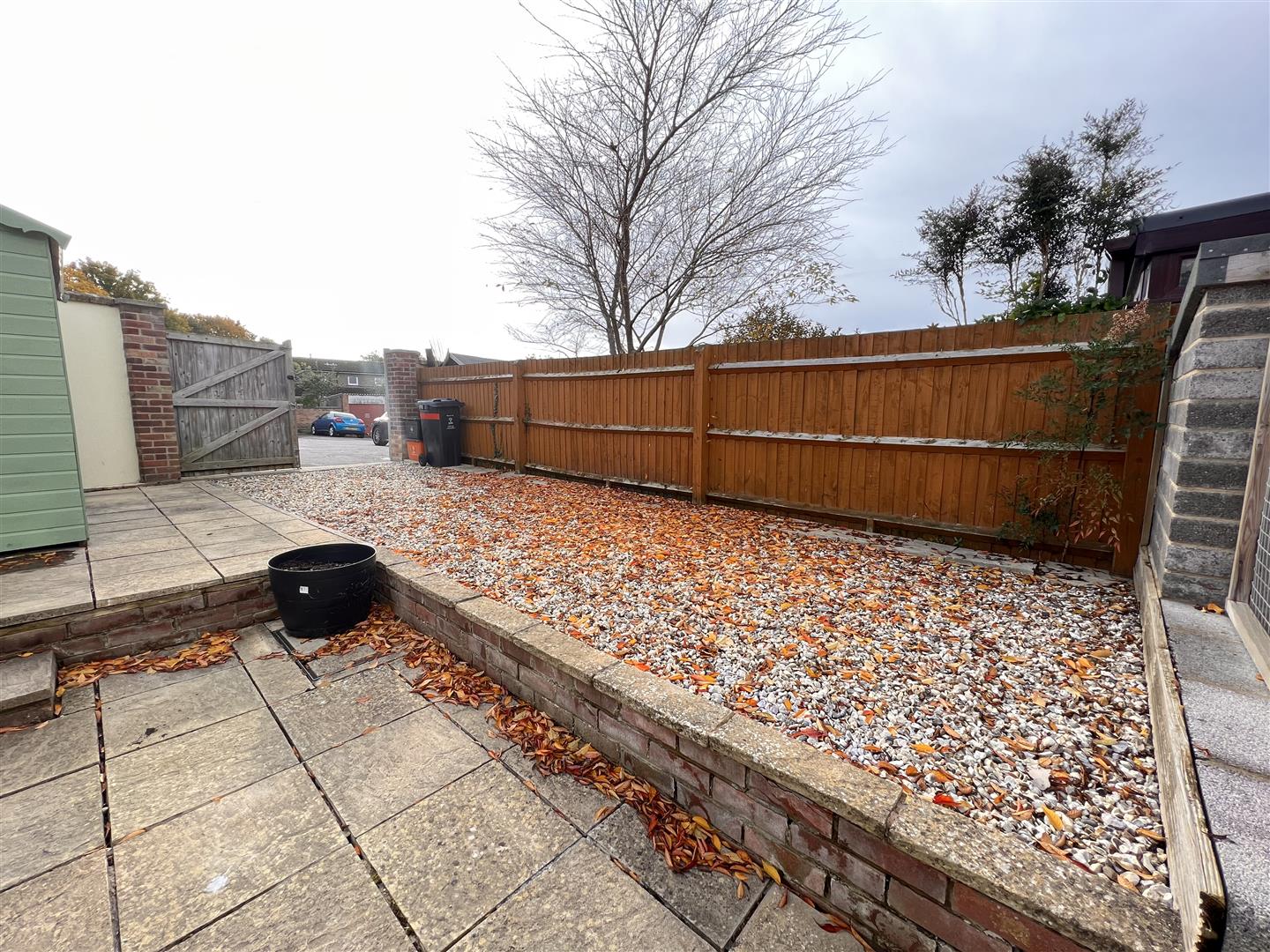 An enclosed easy maintenance enclosed rear garden. Patio to rear of property, small brick built storage unit, step up to new garden shed with power, to side large gravelled parking area with double wooden gates for access.