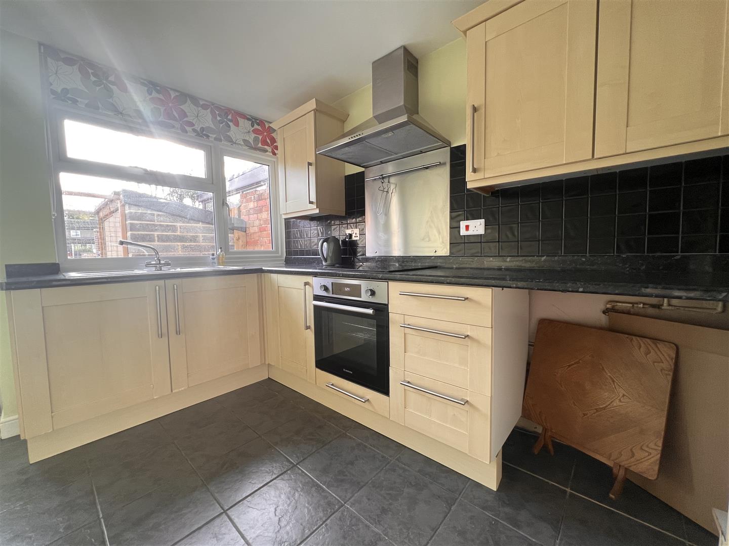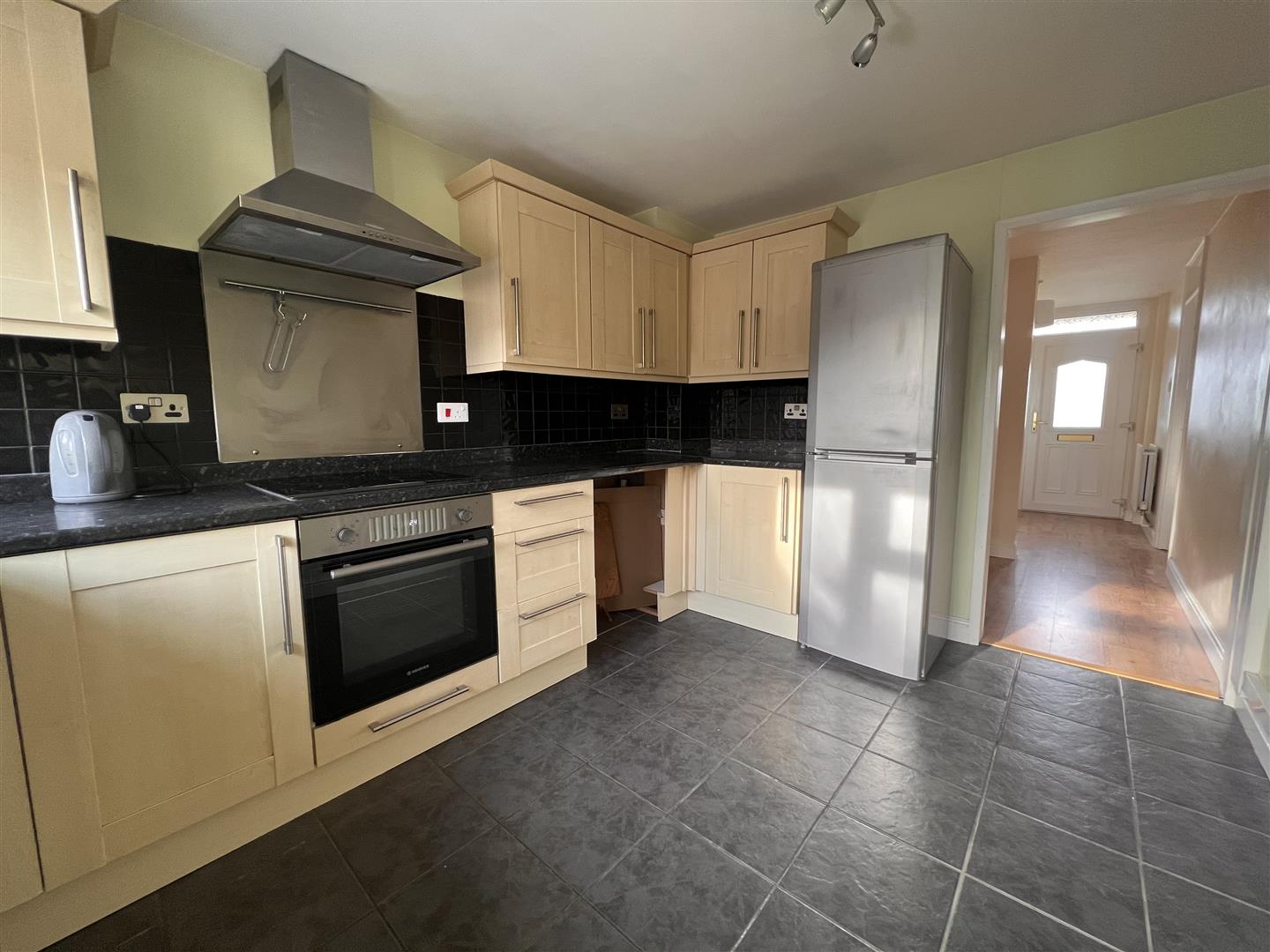 Half glazed uPVC door and uPVC window to rear aspect. A modern fitted kitchen with a selection of units at both eye and base level, matching work top, integrated electric hob with splashback behind, electric oven under and extractor over, one and a half bowl stainless steel sink unit with mixer tap over, space and plumbing for washing machine,. A fridge freezer is already there, radiator, tiled floor.