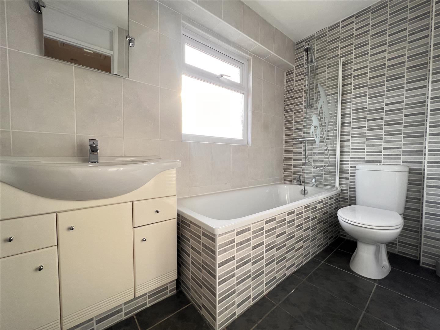 Opaque glazed window to rear aspect. A modern fitted white bathroom suite comprising low level WC, vanity unit with wash basin, mixer tap and a selection of draws under, panelled bath with shower over, shower screen, heated towel rail, tiled walls and floor.