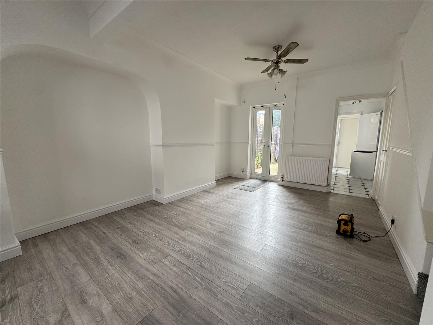 Entrance from front door. Two radiators. Window to front. Double patio style doors to rear garden. Understairs storage.