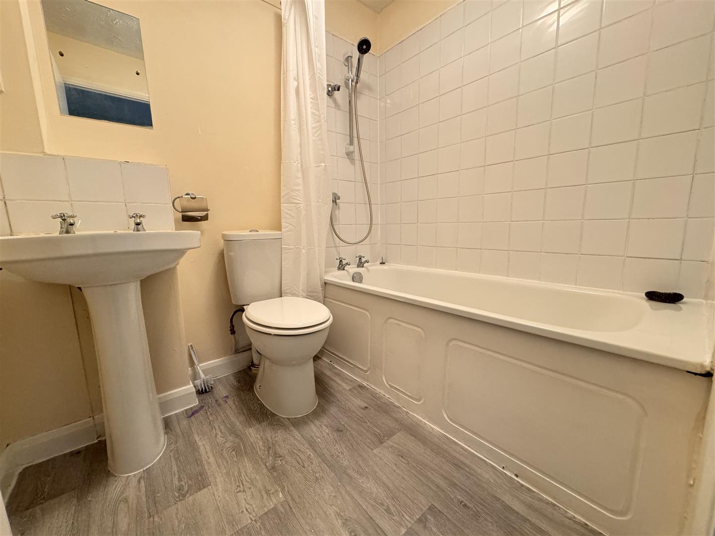 A modern fitted bathroom with a white suite comprising low level WC, pedestal wash basin, panelled bath with shower over, shower curtain, extractor fan, door to landing.