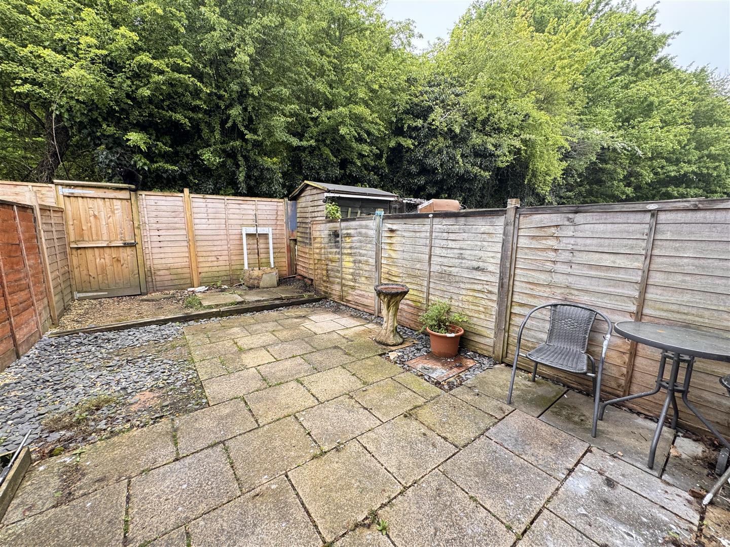 Small patio to rear or property, lawn with border to side, garden shed, wooden gate for rear access, all enclosed by wooden fencing.