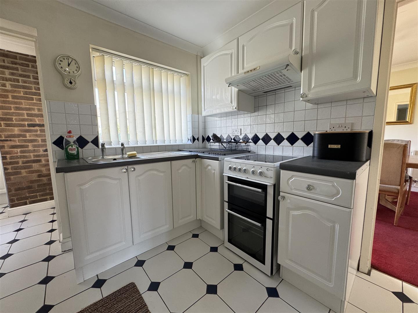 Window to rear, units at eye and base level, matching worktop, stainless steel wash basin, freestanding electric oven with extractor over, tumble drier, arch to utility