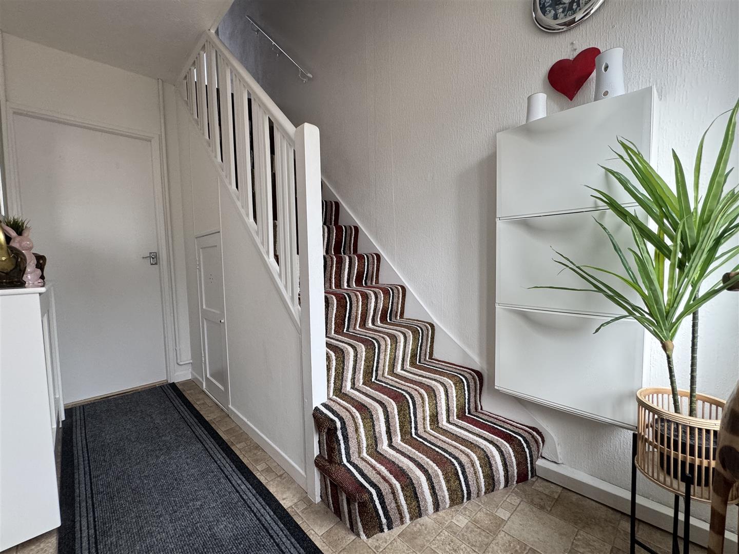 Half glazed uPVC front door to hallway, uPVC window to side, stairs to first floor, radiator, doors to lounge and kitchen, understairs storage cupboard,
