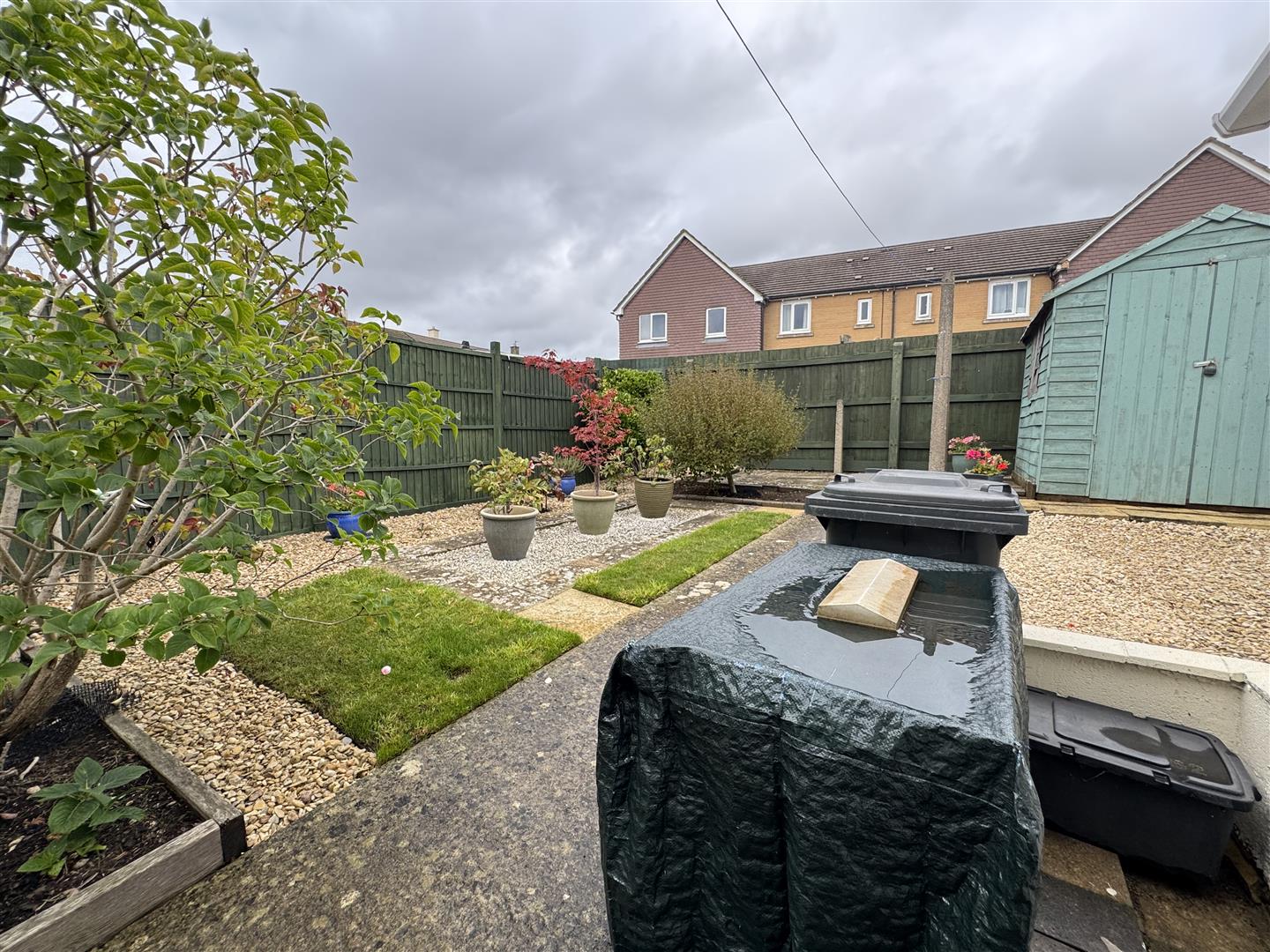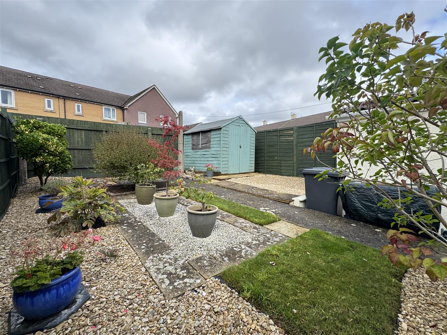 A very well looked after low maintenance rear garden with side gate [ via passage ] for front access, raised beds, two trees, garden shed, decorative stones areas, all surrounded by wooden fencing.