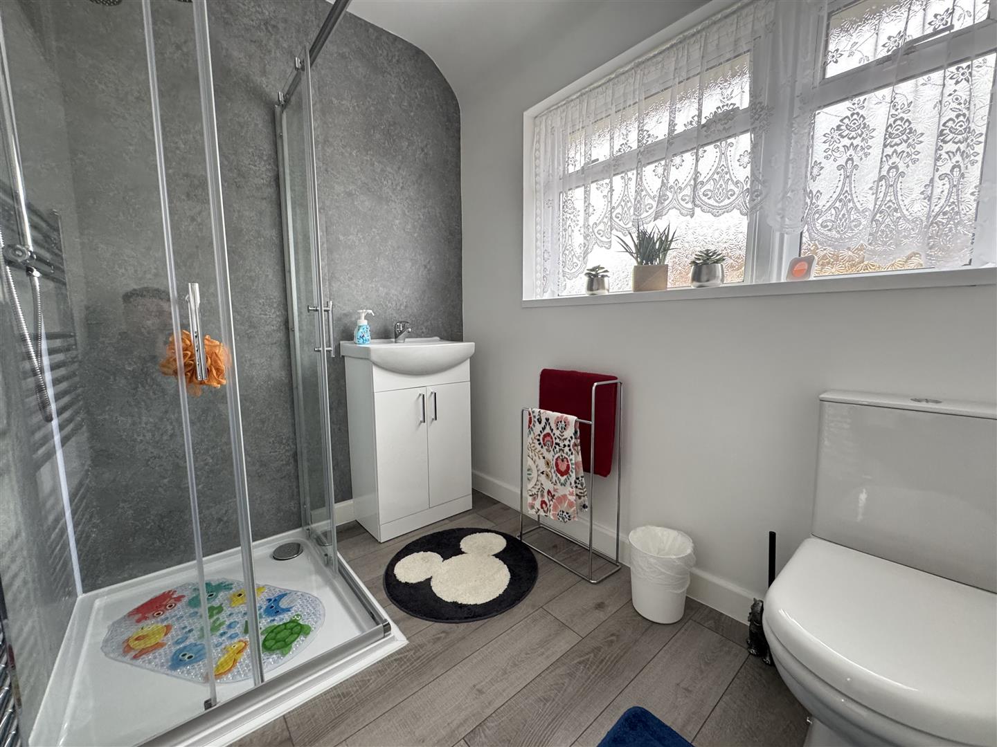 Opaque uPVC window to rear aspect. A modern bathroom suite comprising walk in shower with waterproof back panels, vanity washbasin with mixer tap and cupboard under, low level WC, heated towel rail, water resistant flooring.