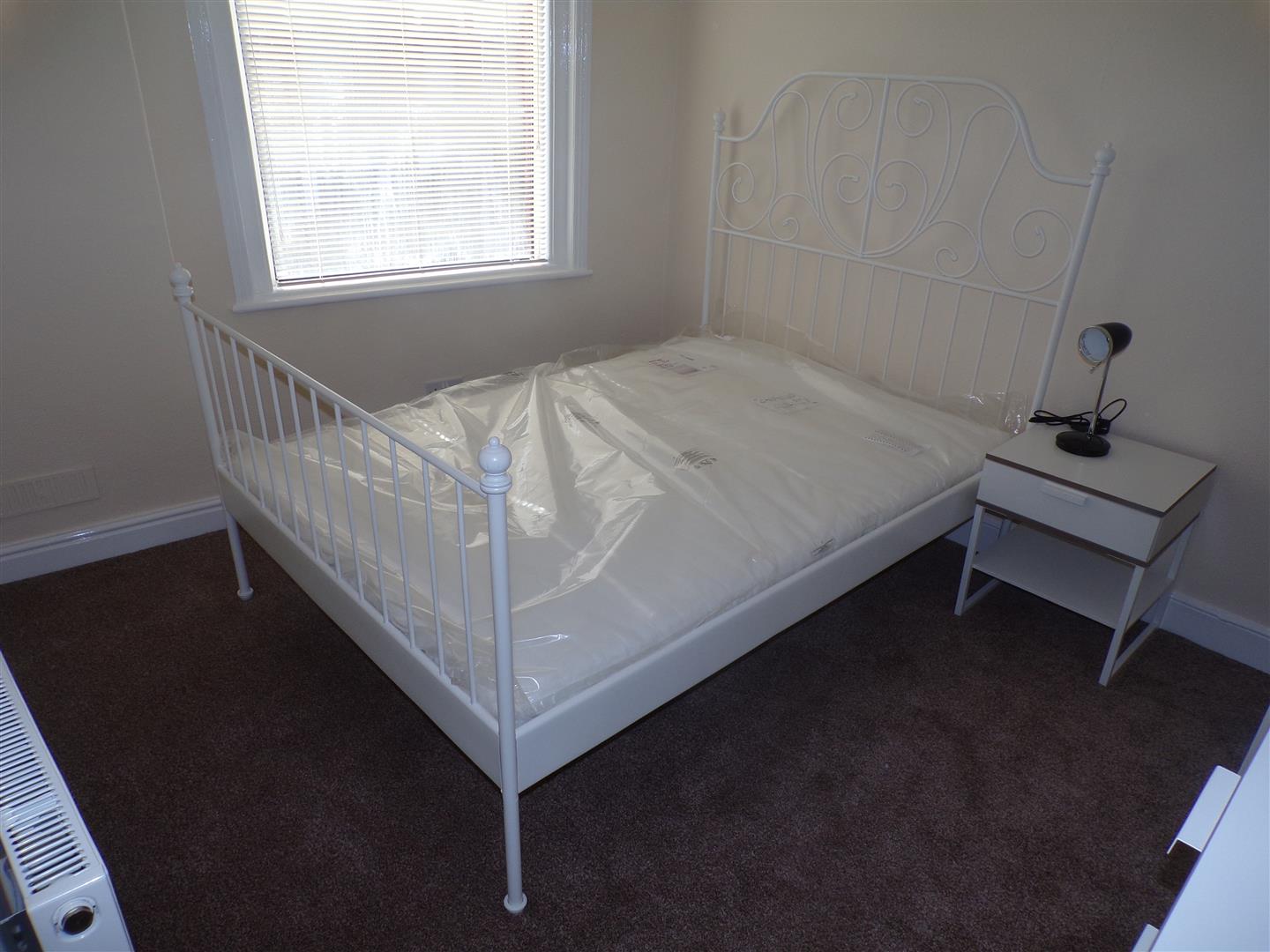 Double bedroom with uPVC window to side aspect, radiator. Includes double bed, bedside table with lamp, chest of draws, wardrobe.