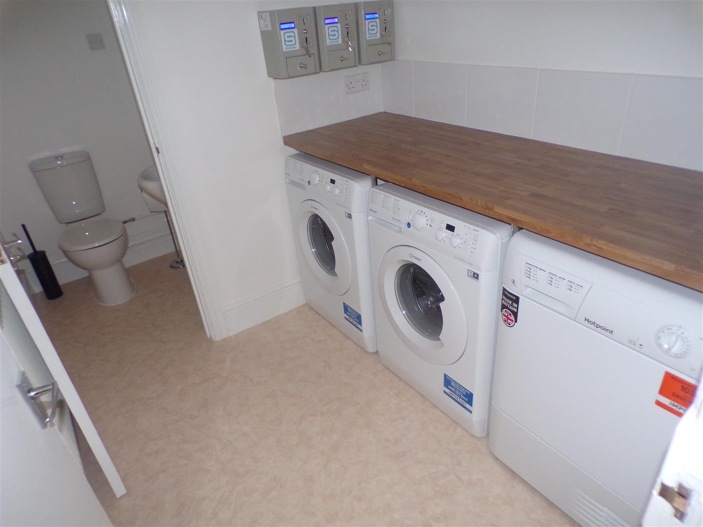 Communal utility room with two washing machines and a tumble drier. These are controlled via a coin-operated timer.