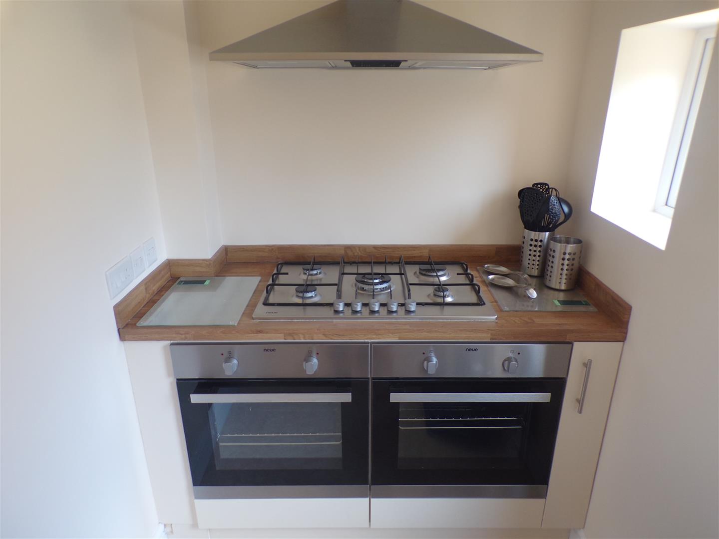 Two uPVC double glazed windows to rear aspect, white units at eye- and base- level, matching wooden work surfaces, single bowl stainless steel sink unit with mixer tap, 2 electric ovens, 5 ring gas hob, extractor fan. Also included is a fridge/ freezer, microwave, kettle and double toaster.