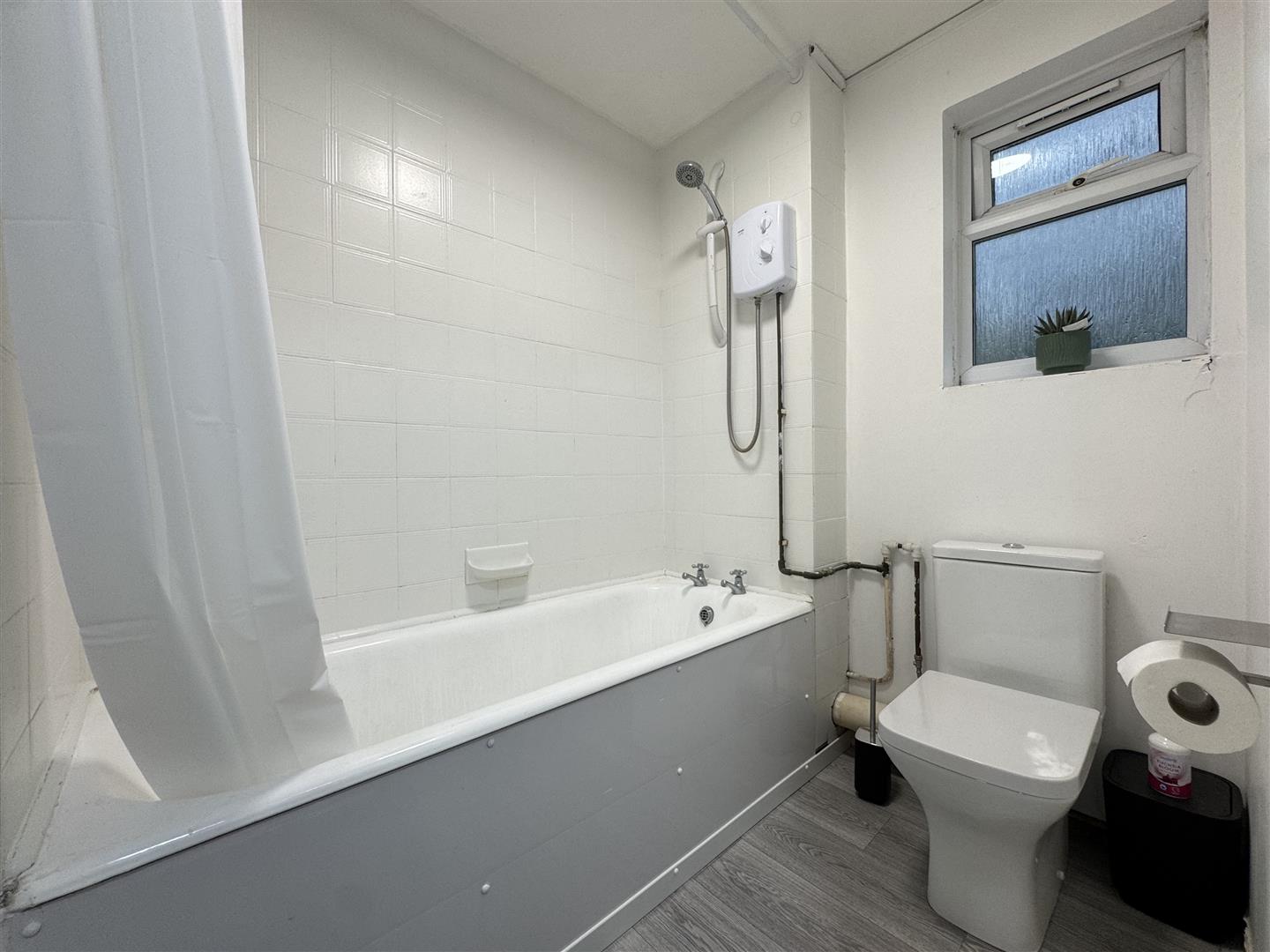 Window to side aspect, bath with electric shower, low level wc, wash basin in unit