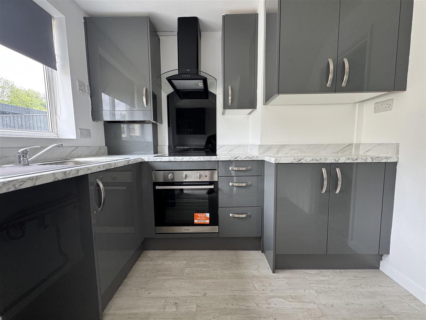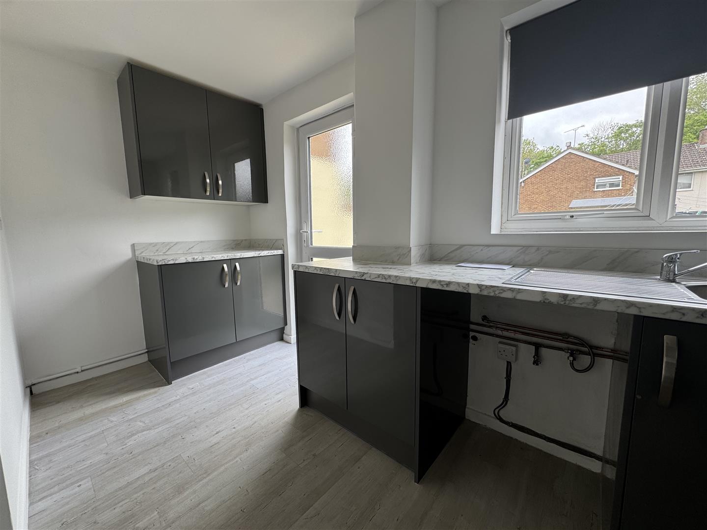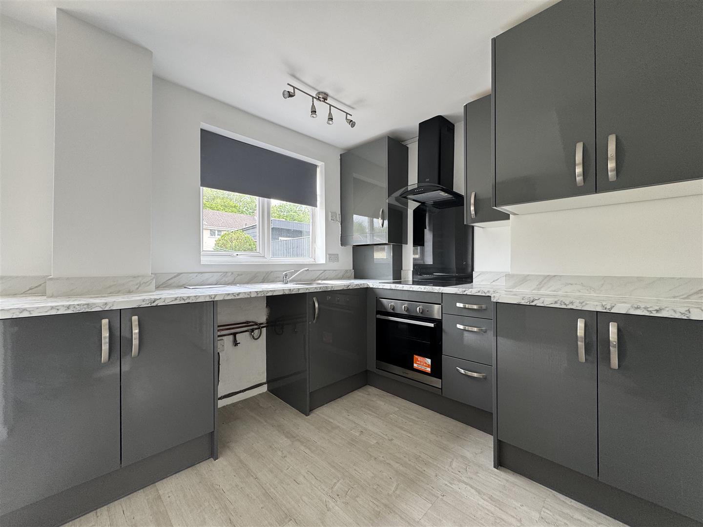 uPVC window and door to rear aspect. A modern fitted kitchen with a selection of units at both eye and base level, matching work surfaces, stainless steel sink unit with mixer tap over, integrated electric hob with oven under and extractor over, space for washing machine, and fridge freezer, radiator.