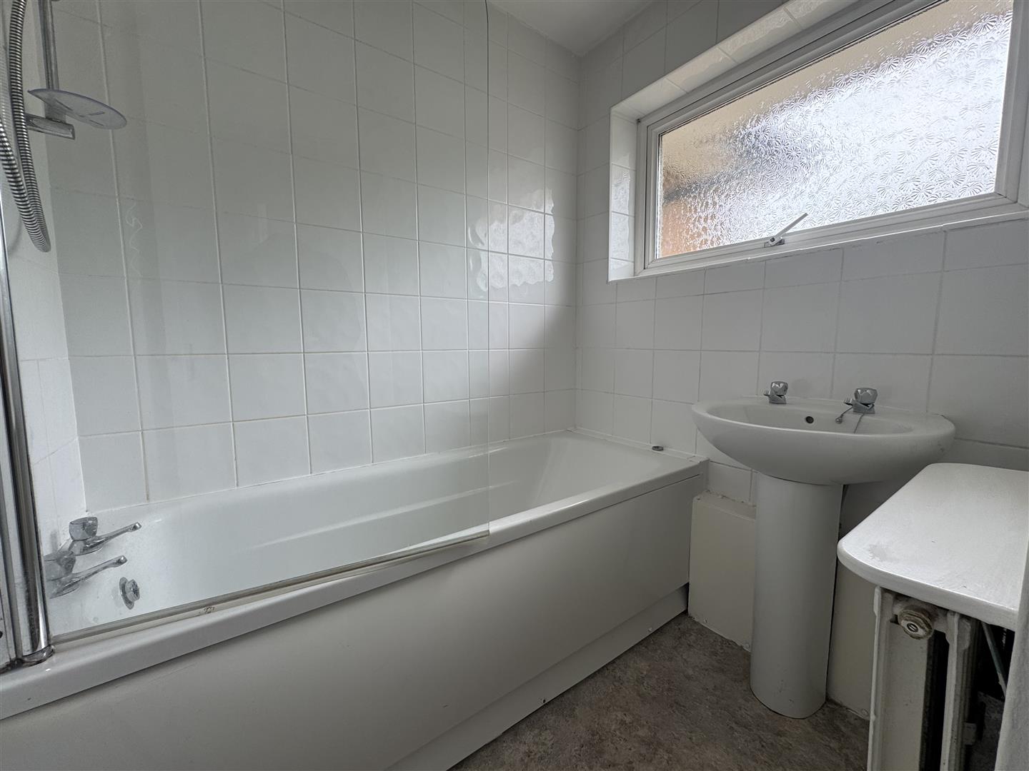 Opaque uPVC window to rear aspect. A modern bathroom suite comprising panelled bath with shower over, wall mounted Mira shower, part tiled walls, pedestal washbasin, radiator,