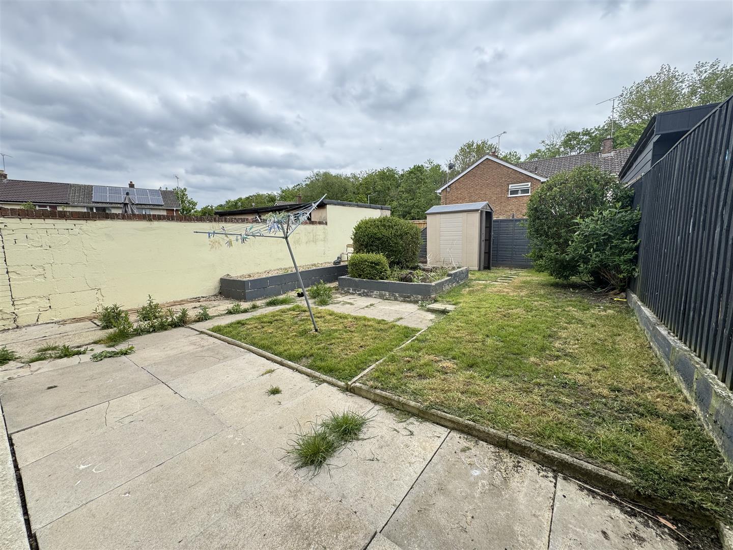 Patio to rear of property with path to garden shed, raised flower bed to centre, shrub borders to side.